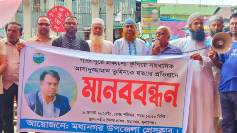 সাংবাদিক তুহিন হত্যার প্রতিবাদে,মধ্যনগরে মানববন্ধন