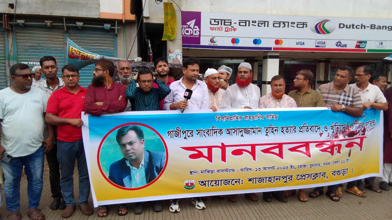 বগুড়ায় শাজাহানপুন সাংবাদিক তুহিন হত্যার প্রতিবাদে মানববন্ধন