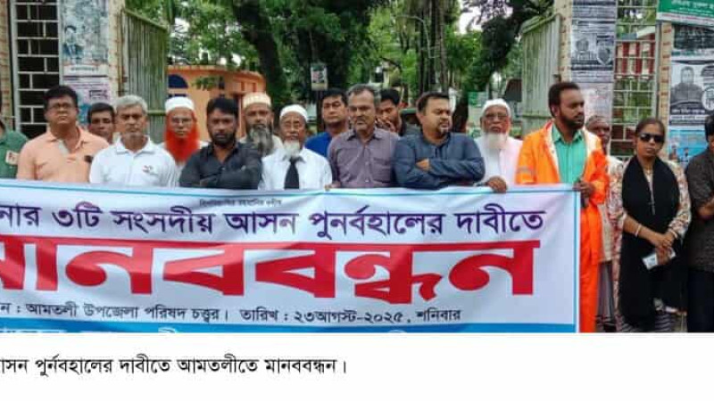 বরগুনা জেলার তিনটি সংসদীয় আসন ফিরে পাওয়ার দাবীতে আমতলীতে মানববন্ধন