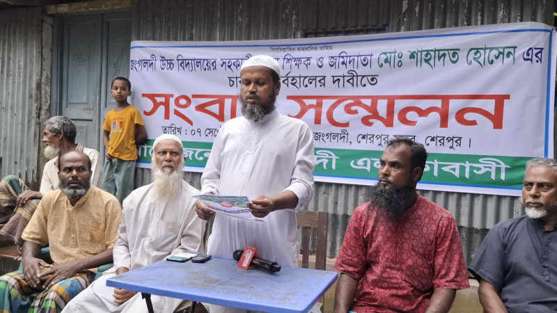 শেরপুরের জঙ্গলদী উচ্চ বিদ্যালয়ের সহকারী প্রধান শিক্ষকের চাকুরী পুর্নবহালের দাবীতে সংবাদ সম্মেলন