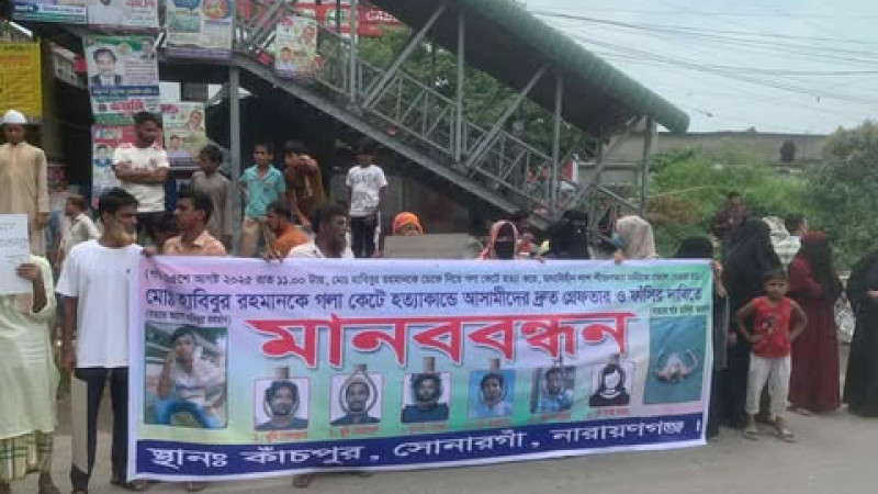 সোনারগাঁওয়ে হাবিব হত্যায় জড়িত আসামী দের ফাঁসি চেয়ে মানববন্ধন করেছেন এলাকাবাসী