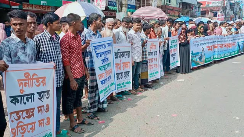 ধোপাজান নদী থেকে বালু উত্তোলন বন্ধের দাবিতে এনসিপির মানববন্ধন