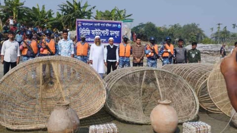 মনপুরার মেঘনায় যৌথ অভিযানে পাঙ্গাশ মাছের পোনা শিকার করার চাই আটক