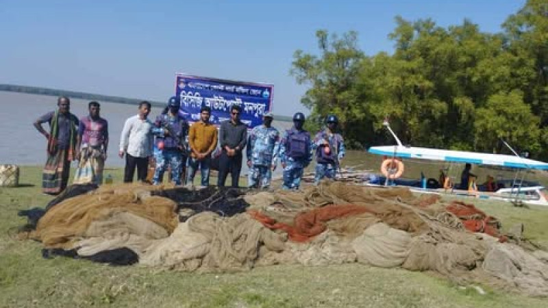 মনপুরার মেঘনায় মৎস্য দপ্তর ও কোস্ট গার্ডের অভিযানে আটক বিহেন্দী-জাল