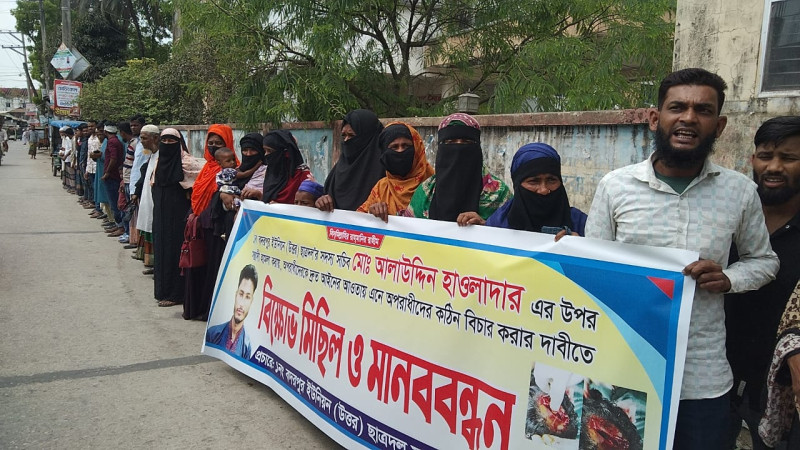 লালমোহনে ইউনিয়ন ছাত্রদল নেতার ওপর হামলার প্রতিবাদে মানববন্ধন