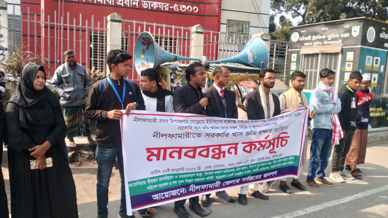 নীলফামারীর হাজীগঞ্জে সরকারি খাস জমি দখল, বিক্রি ও অবৈধ স্থাপনার বিরুদ্ধে মানববন্ধন,গণস্বাক্ষর ও স্মারকলিপি প্রদান