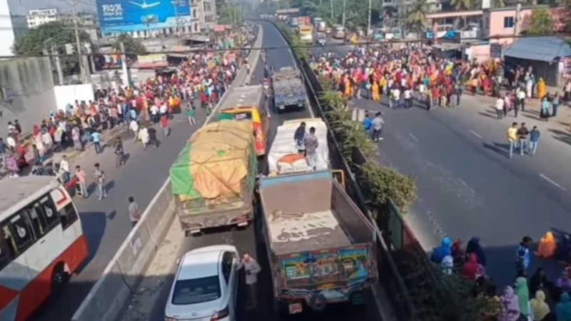 বকেয়া দাবিতে চন্দ্রায় ঢাকা-টাঙ্গাইল মহাসড়ক অবরোধ