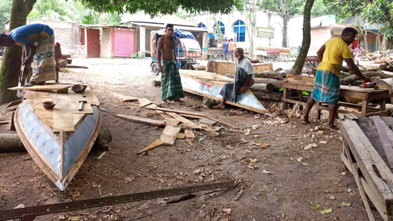 বেড়েছে যমুনার পানি, নৌকা তৈরিতে ব্যস্ত লোকজন