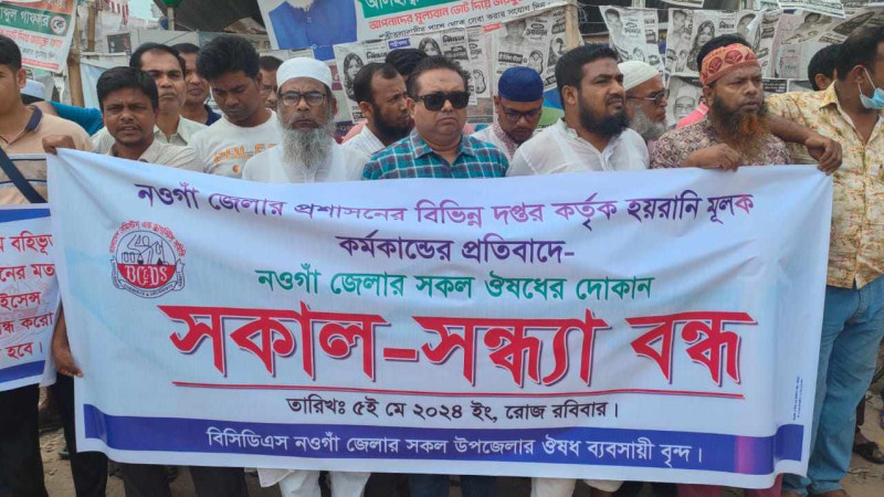 পত্নীতলায় ৭ দফা দাবীতে ঔষধ ব্যবসায়ীদের সকাল-সন্ধ্যা বন্ধ ধর্মঘট
