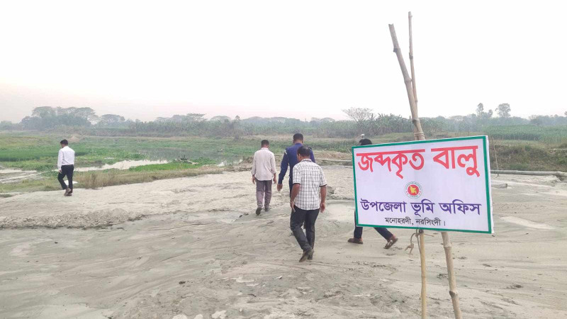 মনোহরদীতে নদী থেকে অবৈধভাবে বালু উত্তোলনের দায়ে ১টি বালুর স্তুপ জব্দ