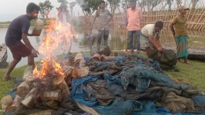 টাঙ্গুয়ার হাওরে প্রশাসনের টানা অভিযান,বিপুল পরিমাণ নেট জালের বাঁধ উচ্ছেদ