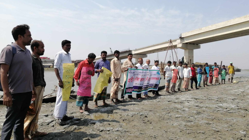 কোহেলিয়া নদীর চরে দাড়িয়ে নদী রক্ষার প্রতিবাদ