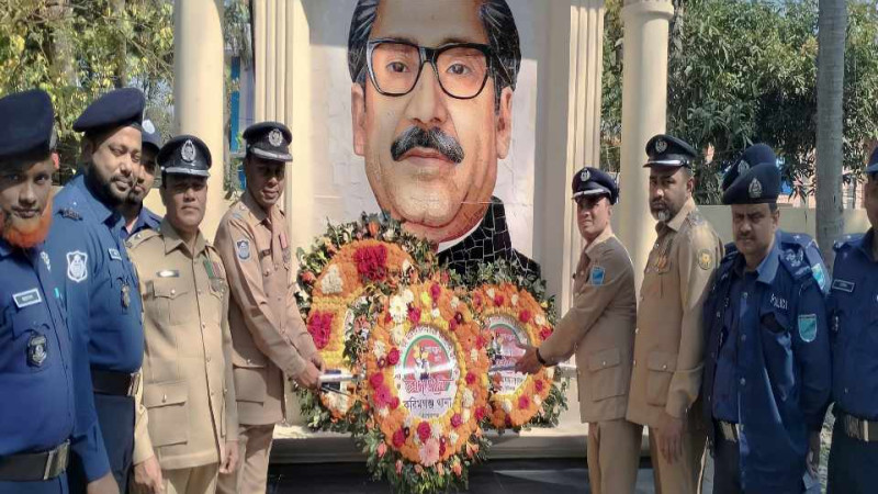 ঐতিহ্যাসিক ৭ই মার্চ উপলক্ষে বঙ্গবন্ধুর প্রতিকৃতিতে পুষ্পস্তবক অর্পণ করেন করিমগঞ্জ থানা