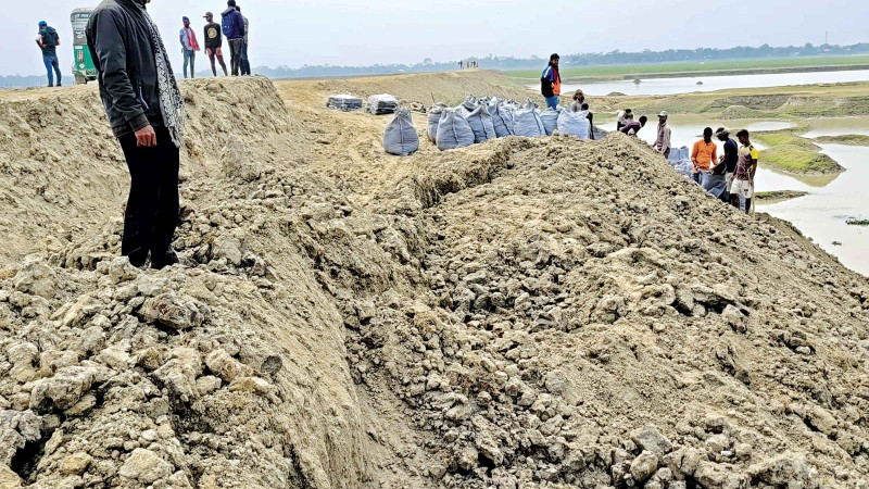 শান্তিগঞ্জে কাজ শেষের আগেই ফসল রক্ষা বাঁধে ধস